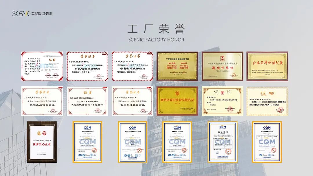 “2018-2022年度廣東省建材行業綠色制造優秀企業”、“2018-2022年度廣東省建材行業科技創新優秀企業”、“2021年度廣東省建筑材料科學技術獎一等獎”、“低碳發展優秀企業”、“智能制造優秀企業”,正是一連串的榮譽,印證了森尼陶瓷·巖板原創品牌“高價值”的綜合實力。
