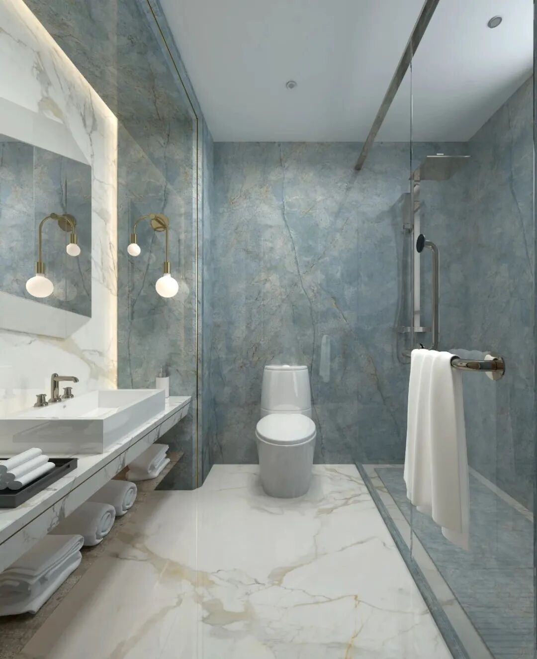 The sea of stars belongs to dark color, with white marble countertop and kalacatagin ground match each other, light and luxurious feeling arises spontaneously. Contracted and fashionable space style, send out the ideal color in a dream.