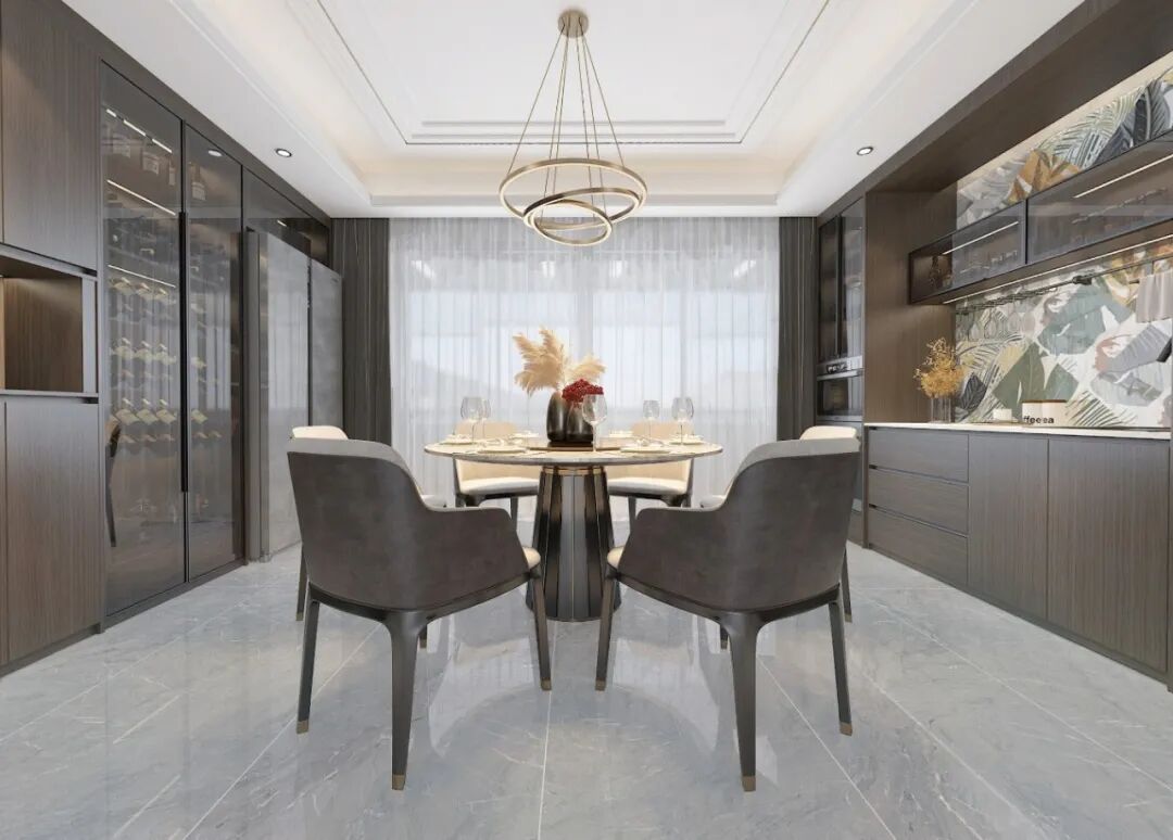 餐廳大面積的紅木色飾面與灰色地面相得映彰,幾張棕色的餐椅加以點綴,使整個空間變得精致起來。