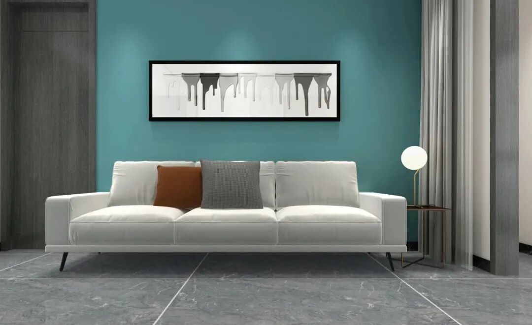 全皮制成的銀色沙發搭配海藍色墻漆,獨特而優雅。