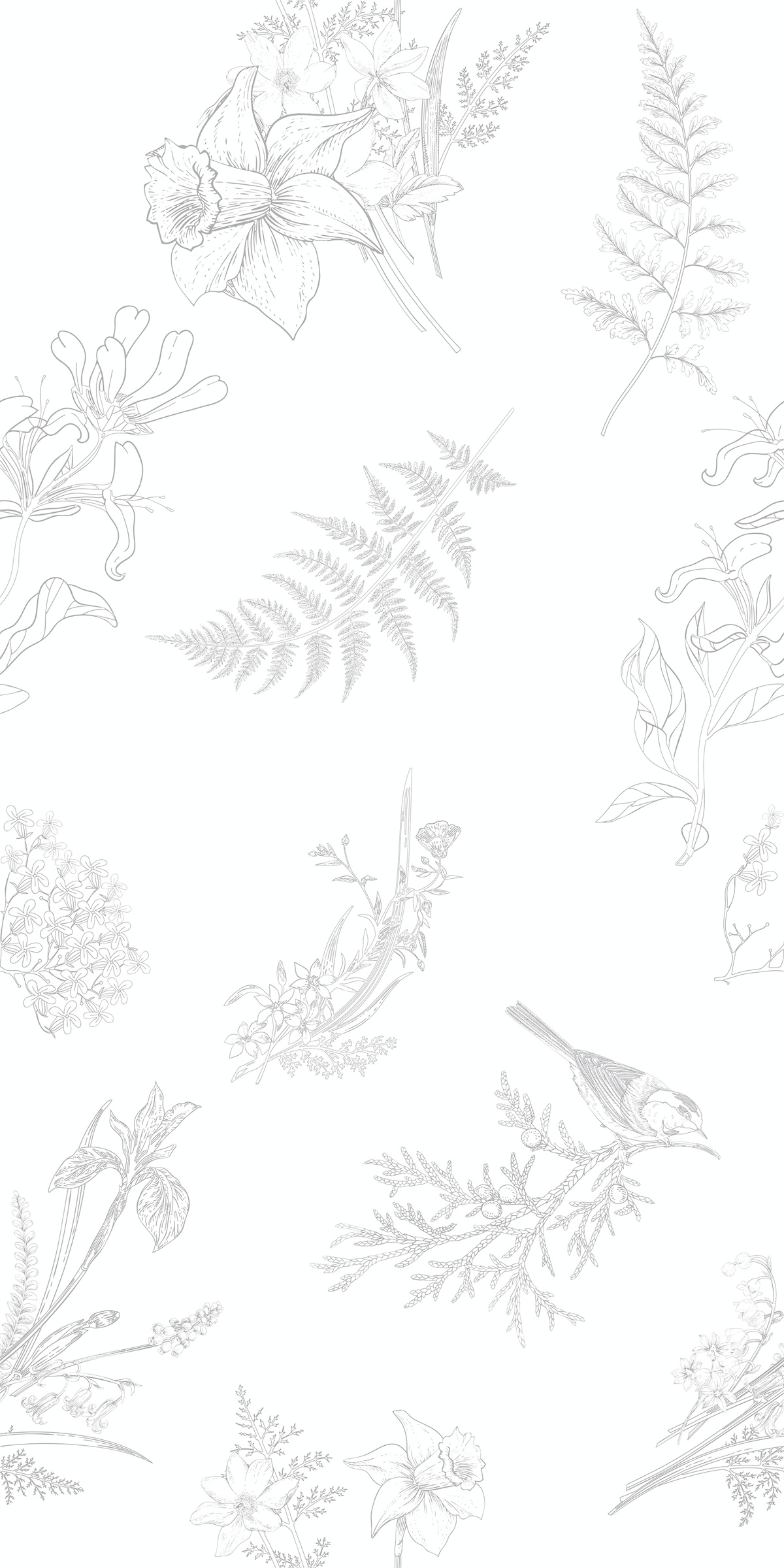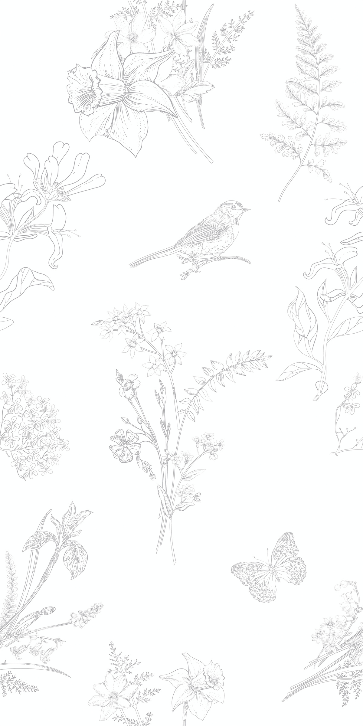 線描呈現(xiàn)小鳥、山茶與蕨葉,元素自然散布,融入莊周夢蝶的哲思與奇幻感。