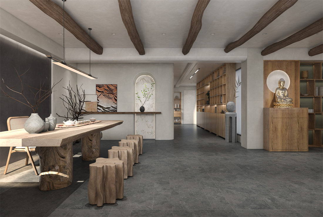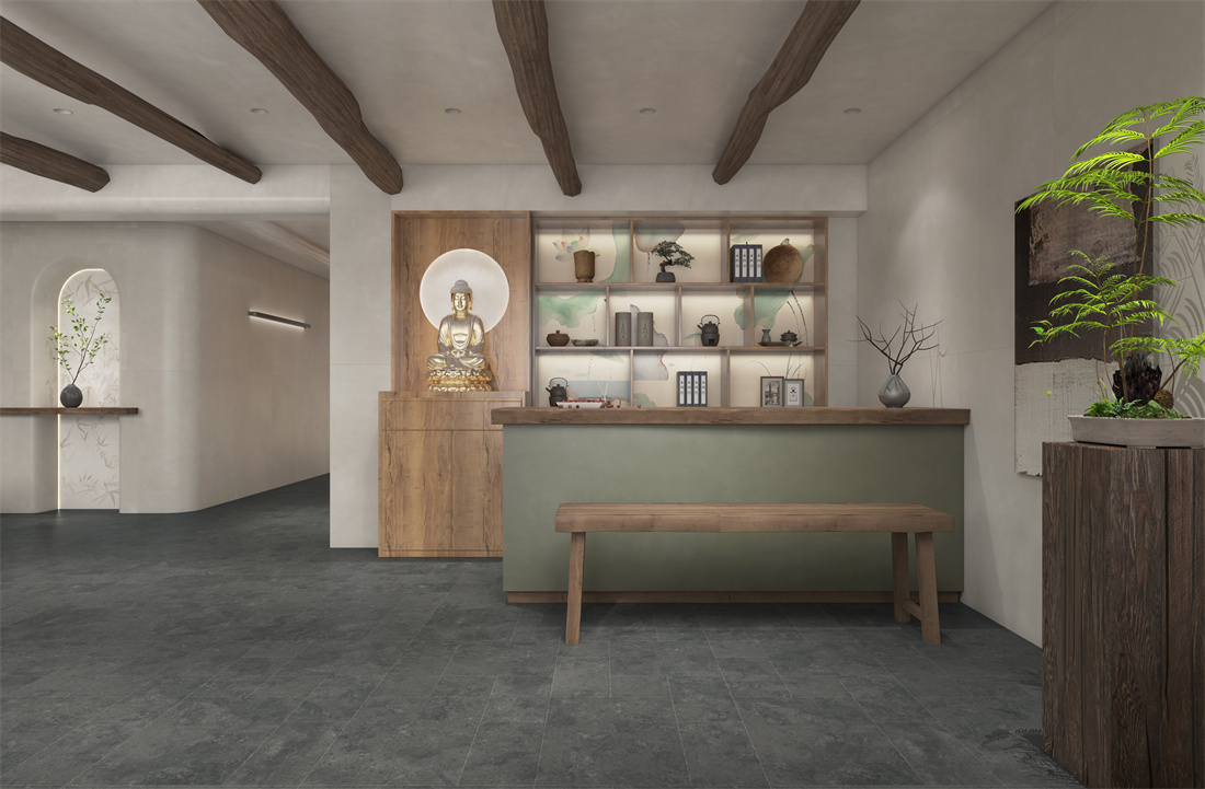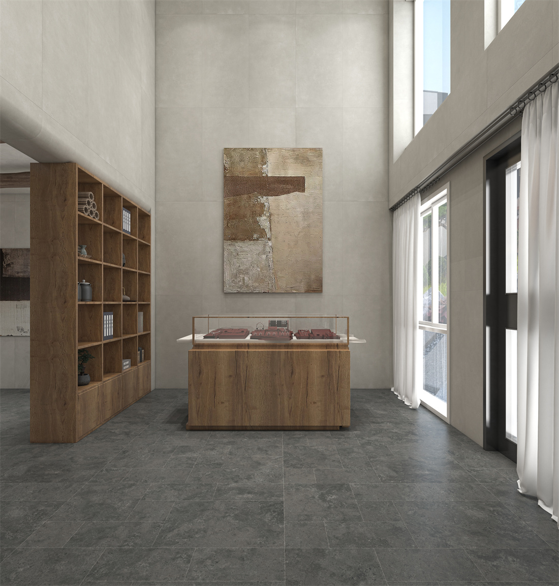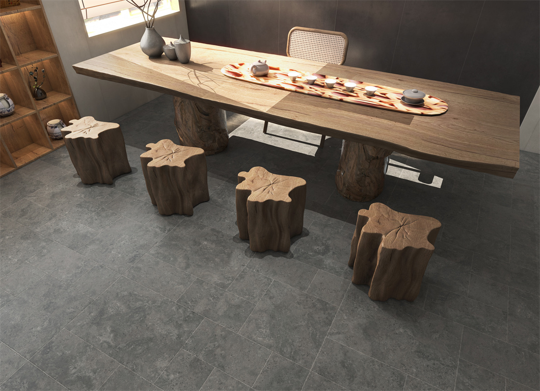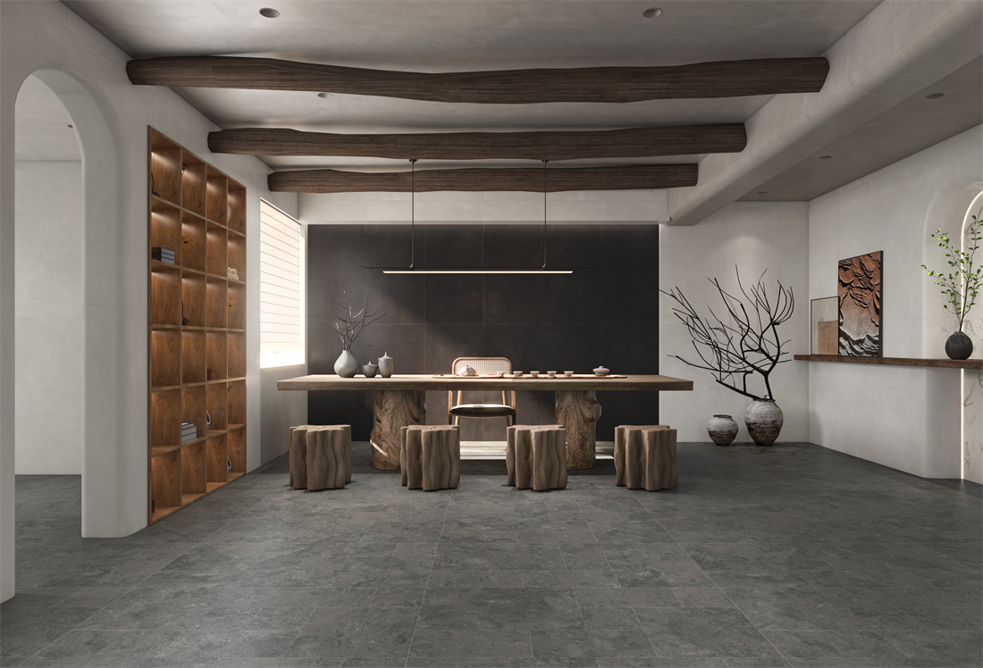 深灰色仿石質感,紋理深邃而富有變化。猶如雨后的巴黎石板路,營造出沉靜內斂的現代空間。